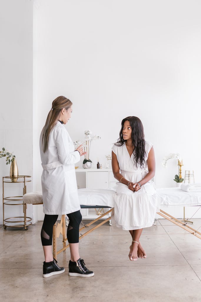A spa professional discussing self-care with a client indoors, promoting relaxation and wellness.